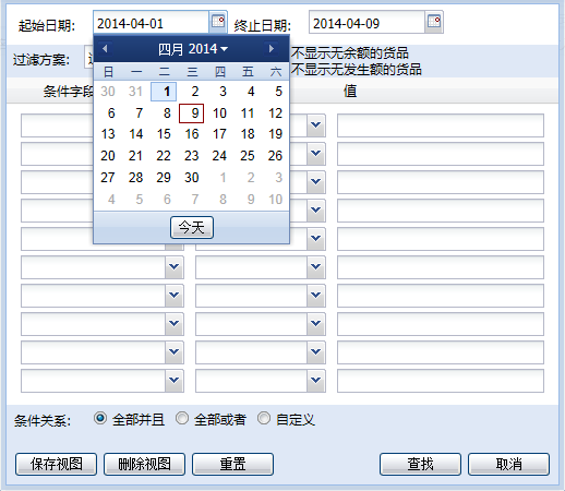 系统统计的数据范围通常比较宽泛,有时报表数据量太大查看起来不方便,而且大量数据进行统计时,还会拖慢系统速度,因此,在打开报表时系统提供了一个条件过滤窗口,在报表窗口可以点击[查找],打开该过滤条件窗口,可以在此设置过滤条件,既可以用单一条件进行过滤,也可以定义多重条件交叉过滤(此功能与