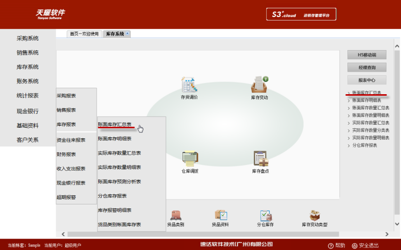 也可以展开左侧「统计报表」→「库存报表」→「账面库存汇总表」,同样可以打开所选的报表。