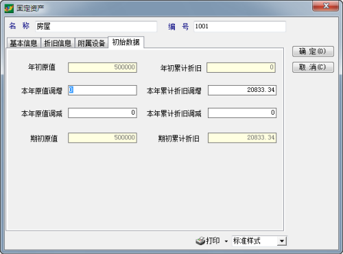 “固定资产”编辑界面在初始化时分为四个页面:基本信息、折旧信息、附属设备、初始数据(结账后再增加固定资产资料时无此页面)。以下分别予以说明: