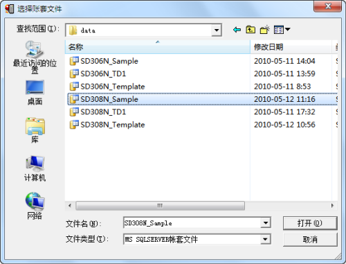 2. 本系统仅支持SQL Server账套文件,因此点击SQL数据文件右侧按钮,打开“选择账套文件”窗口,找到存放账套文件的文件夹,从中选择需要引入的账套;