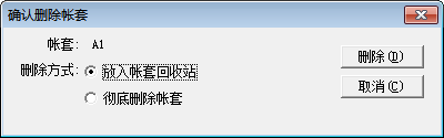 1. 在‘账套维护’窗口中选择将要删除的账套,然后点击[其它维护]→[删除账套],这时系统需要您确认采用哪种删除方式: